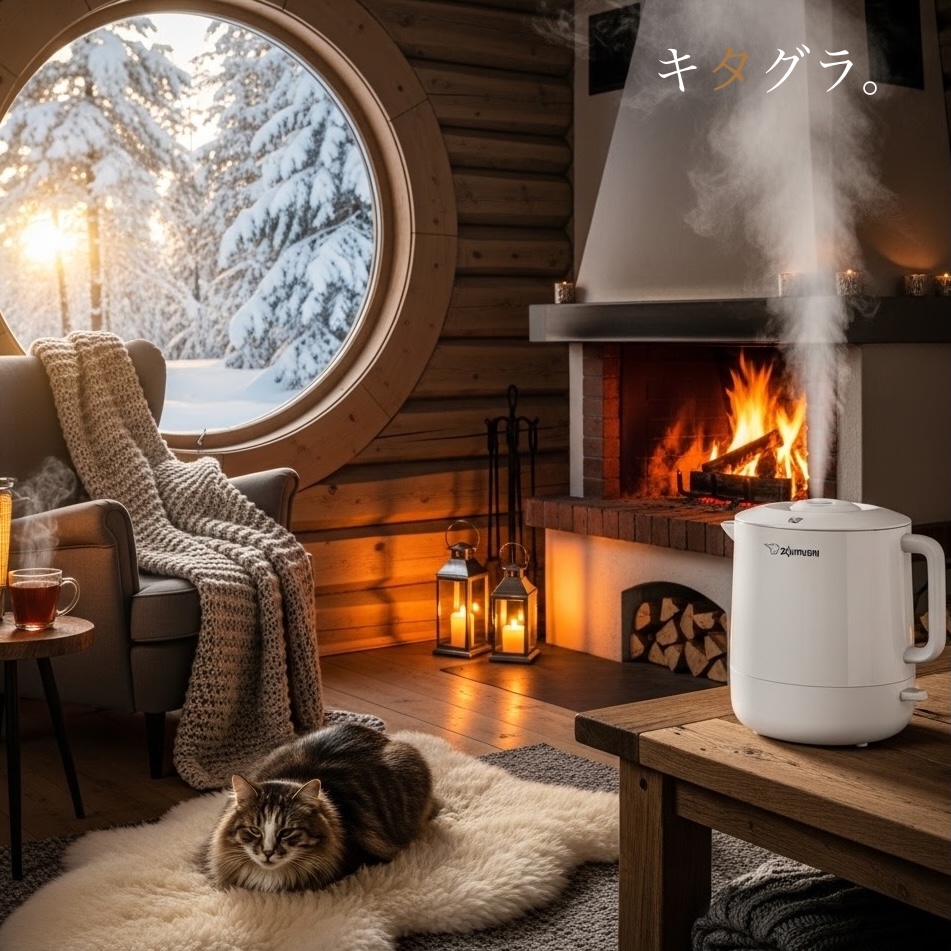 沸騰する時はそれなりに音がします。でも、この「シュンシュン」という音が、かえって冬のログハウスのような安心感を与えてくれることも。集中したい作業中や動画編集時は、少し離れた場所に置き、次回紹介するサーキュレーターで循環させるのが「キタグラ。」流のコツです。